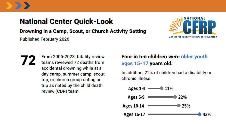 This Quick-Look looks at the data from deaths of children who died of accidental drowning in a camp, scout, or church activity setting.